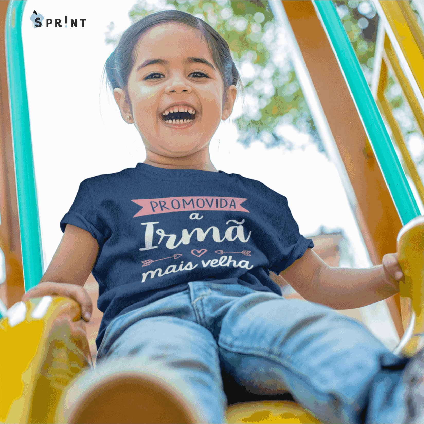 Criança sorridente no escorrega com camisola azul escura escrita 'PROMOVIDA a Irmã mais velha'.