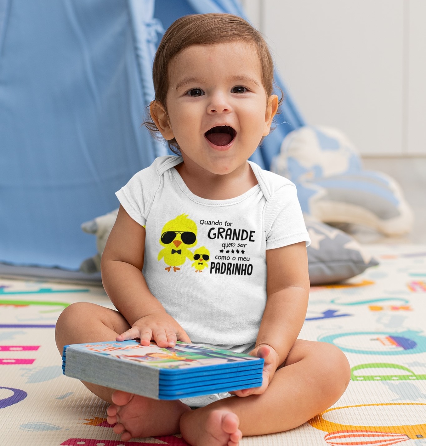 Bebé sentado com body branco estampado com dois pintainhos amarelos e texto em português