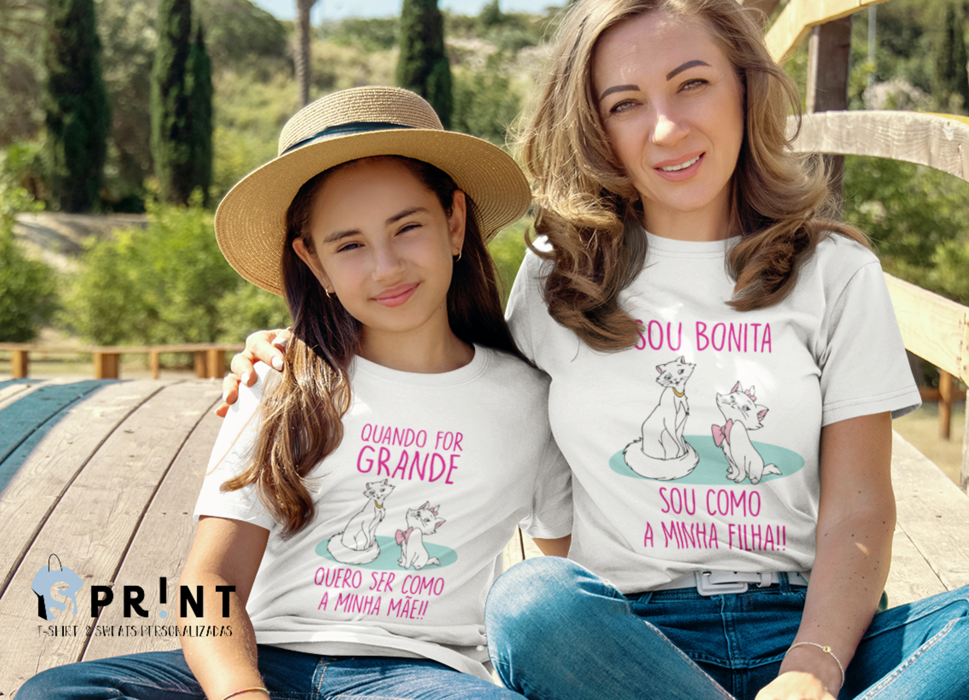 Duas pessoas usando t-shirts brancas com desenhos de gatos e textos em português sentadas ao ar livre