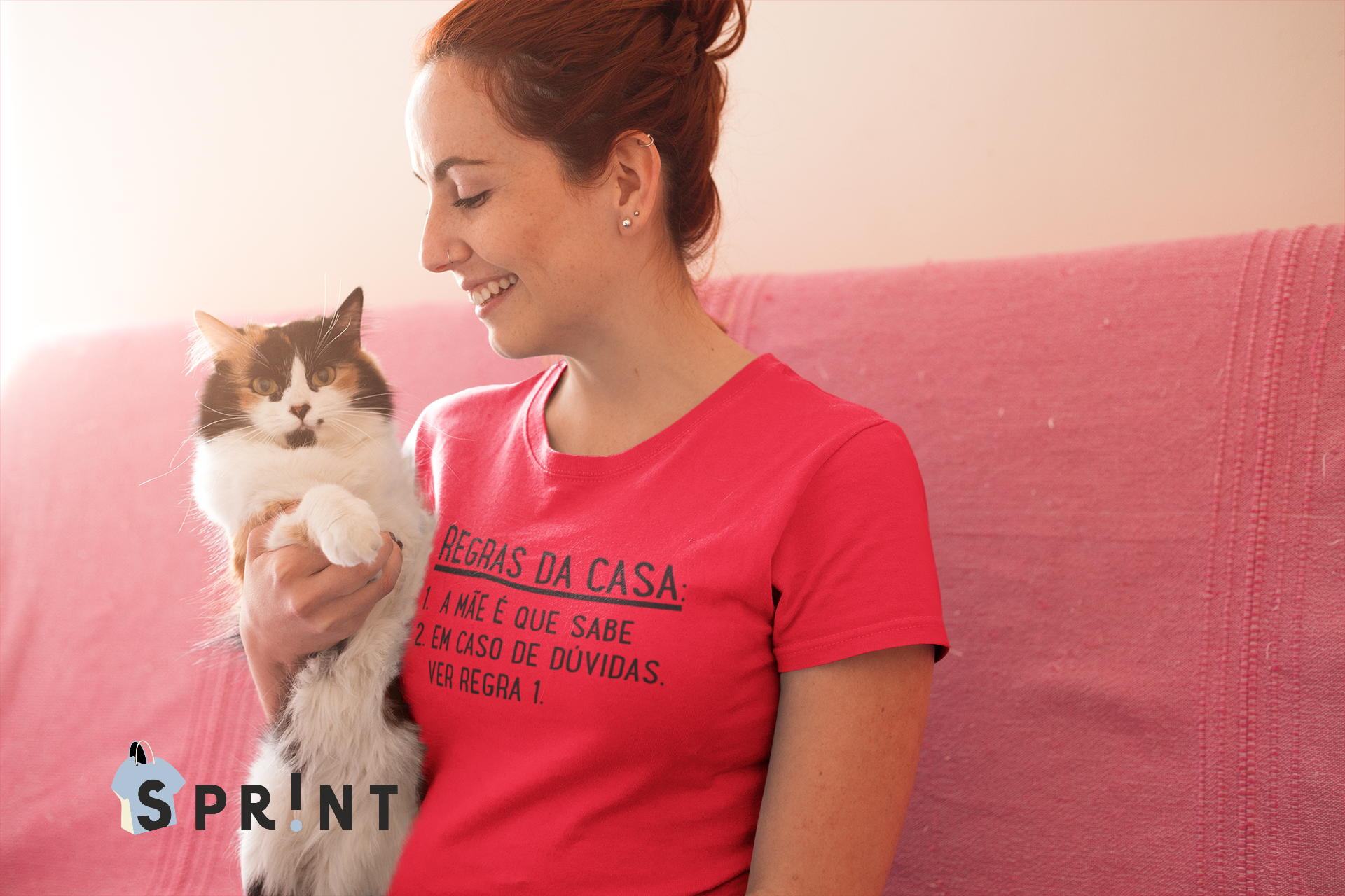 Mulher com camisola rosa segurando gato branco num sofá cor-de-rosa