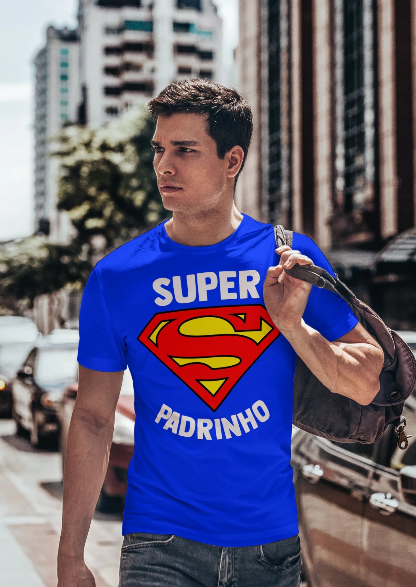 Homem jovem com t-shirt azul Super Padrinho na rua