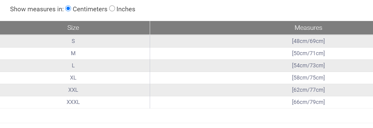 Tabela de tamanhos com medidas em centímetros e polegadas para vários tamanhos de roupa.
