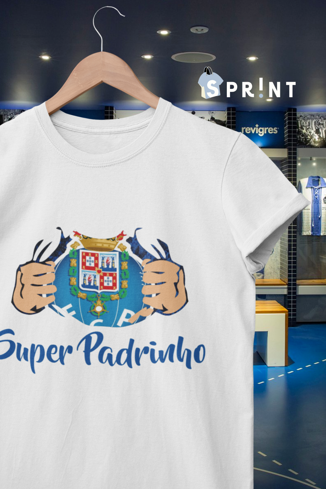T-shirt branca com design Super Padrinho pendurada em cabide de madeira