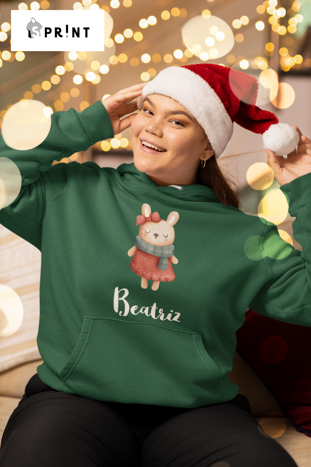 Sweatshirt verde com estampa de coelho e nome Beatriz, usado com gorro de Natal num ambiente festivo