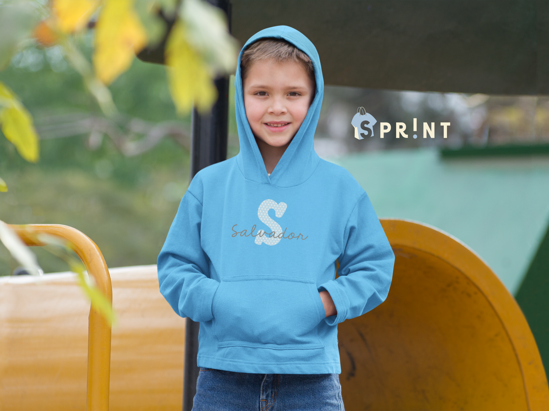 Menino com hoodie azul claro com 'S' e 'Salvador' em dourado, ao ar livre, com objetos amarelos ao fundo