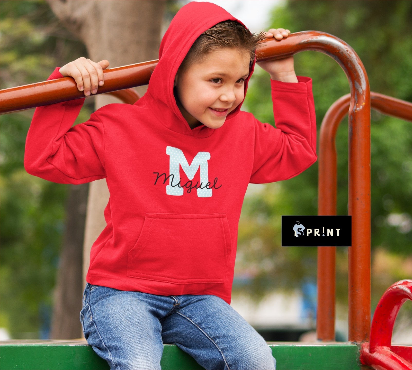 Criança com camisola vermelha com capuz e estampa 'M Miguel', sentada em parque infantil