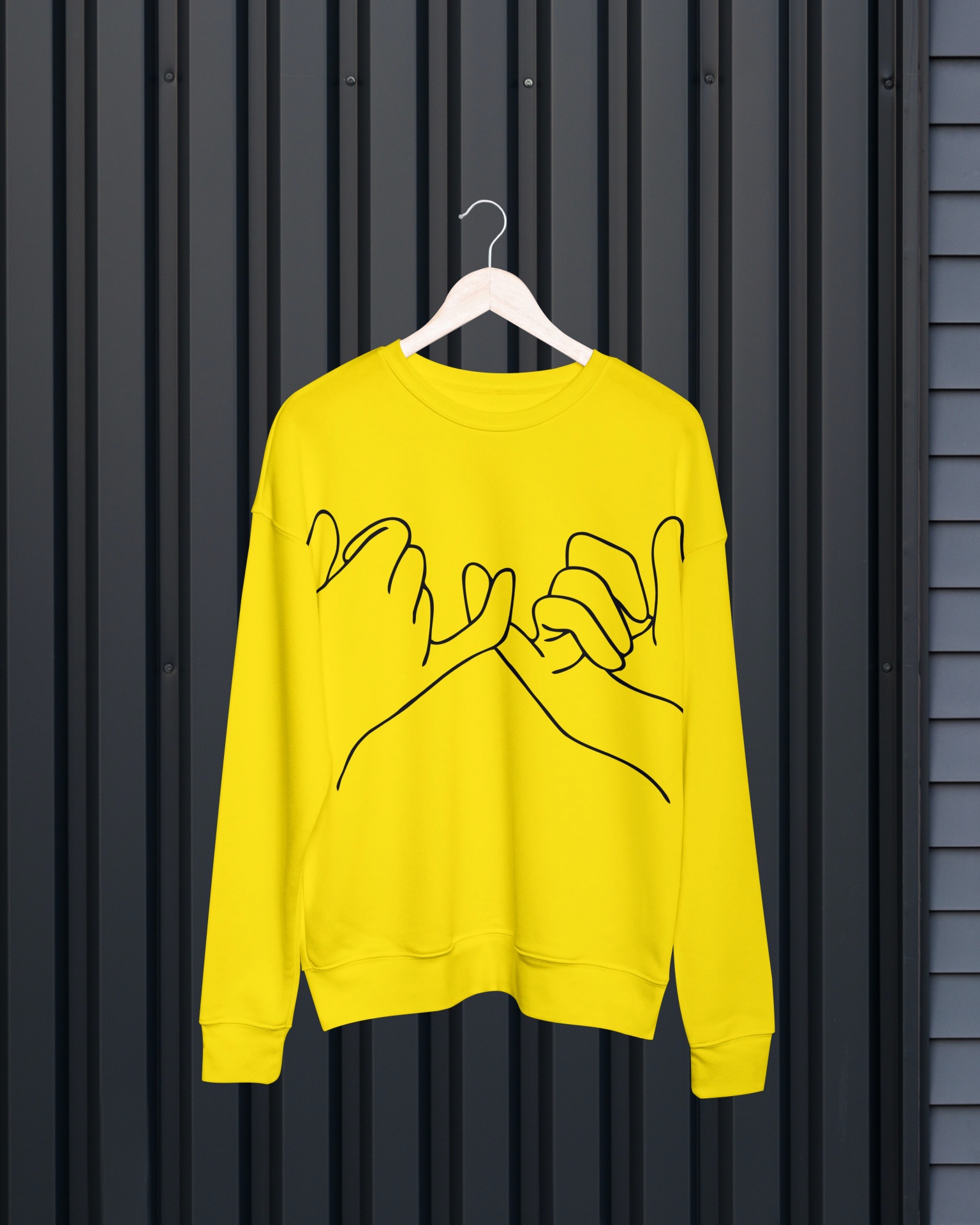 Sweatshirt amarela com desenho de mãos entrelaçadas em preto
