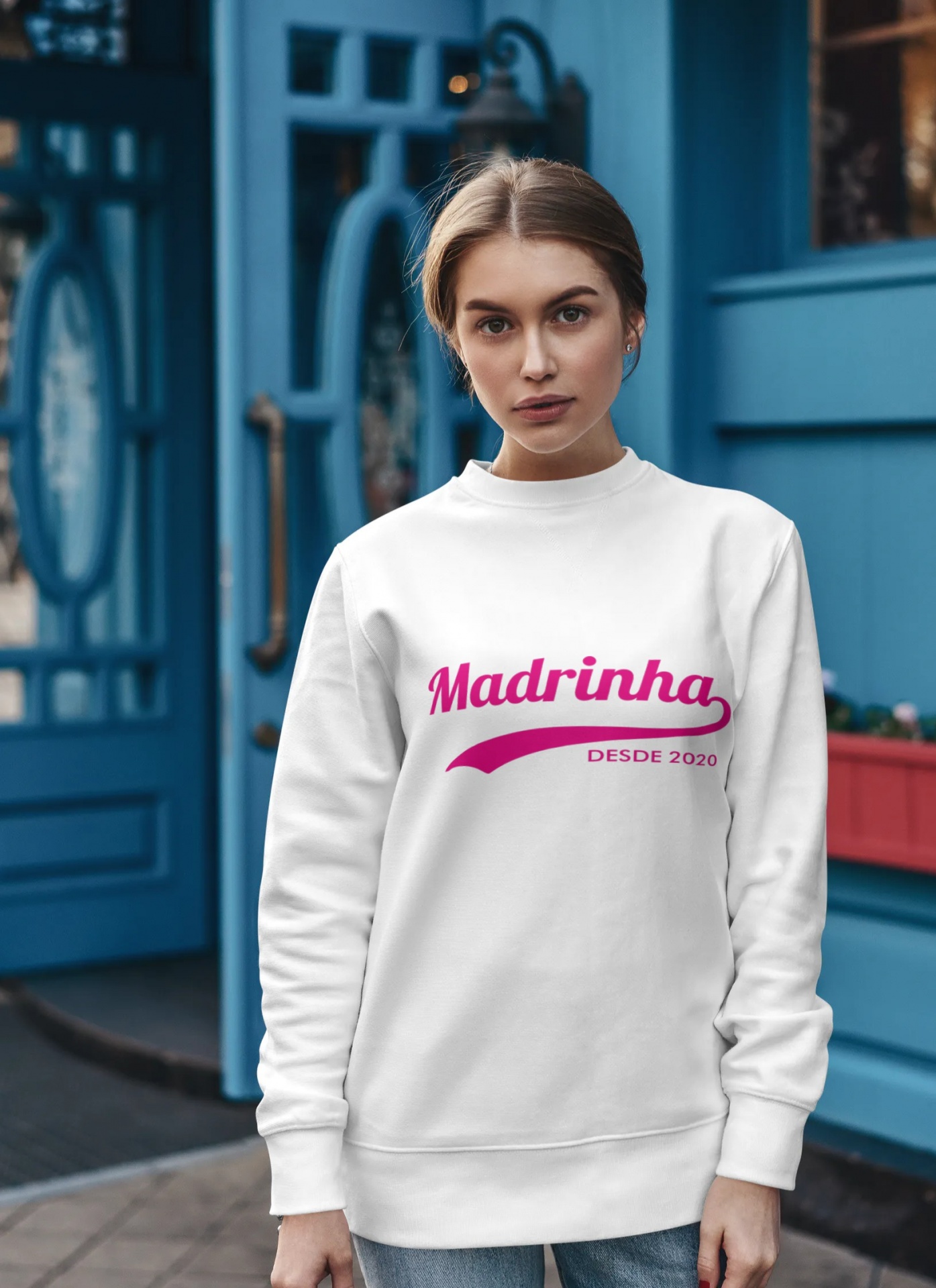 Mulher veste sweatshirt branca com texto rosa 'Madrinha DESDE 2020' em frente a porta azul