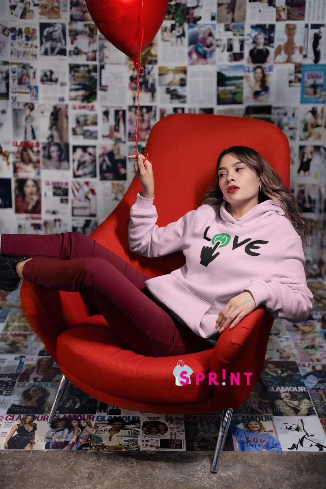 Mulher com hoodie LOVE rosa numa cadeira vermelha com balão de coração vermelho