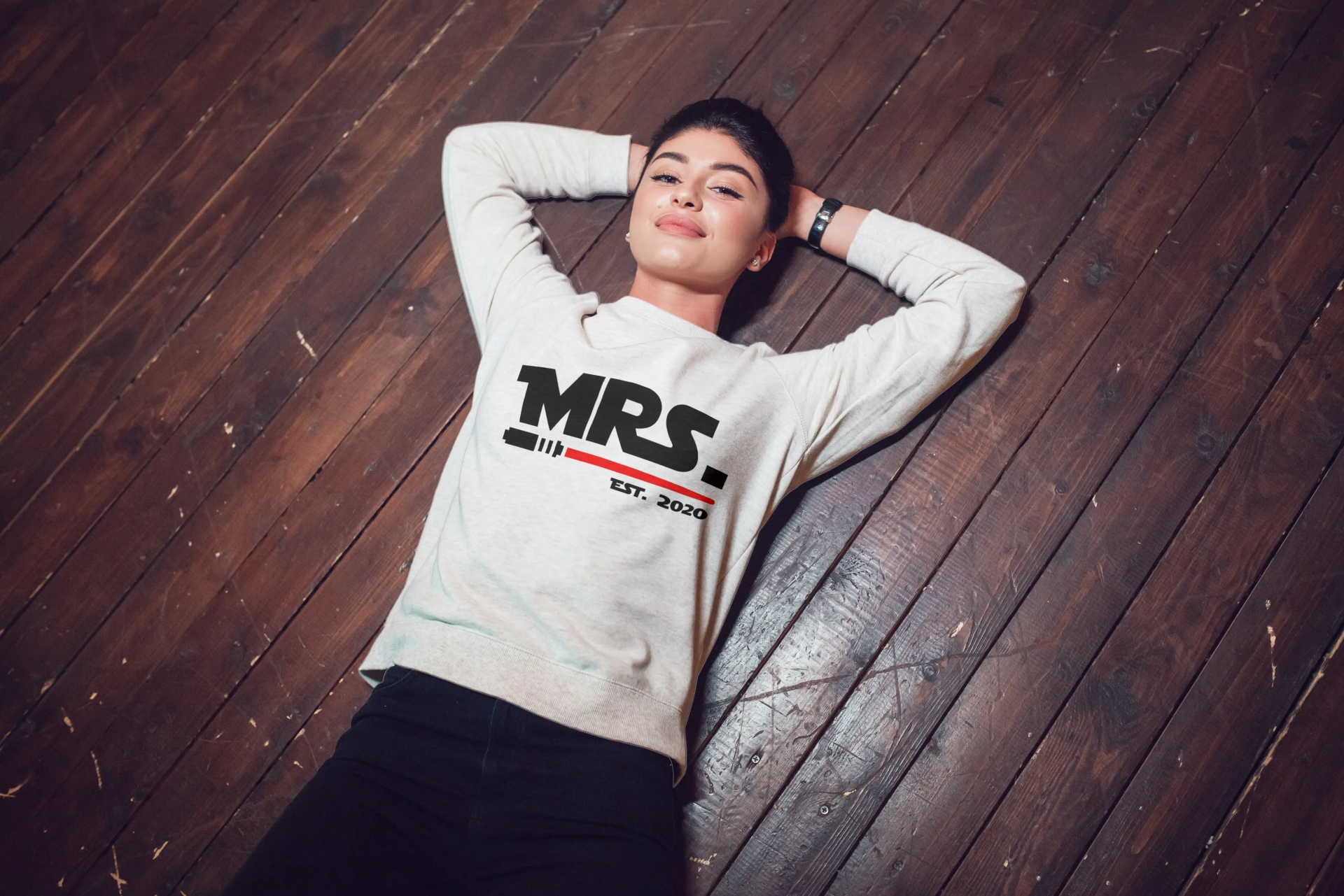 Mulher deitada em chão de madeira vestindo sweat cinzento com texto MRS. EST. 2020 e calças pretas