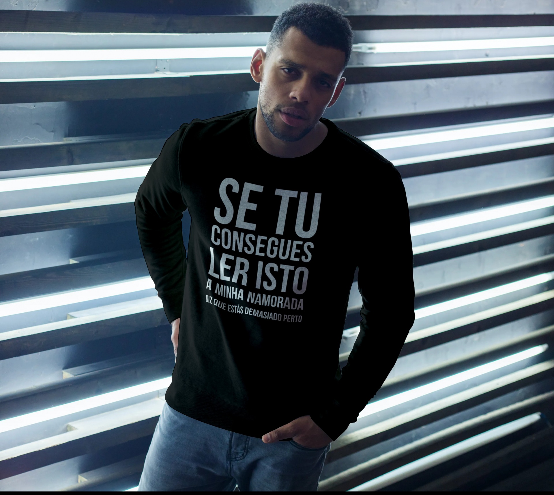 Homem com camisola preta com texto branco e calças de ganga encostado a estrutura metálica prateada com luzes.