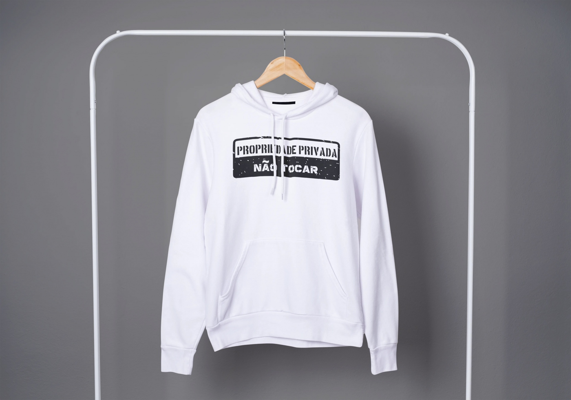 Sweatshirt branca com texto preto suspensa num cabide em estrutura metálica branca