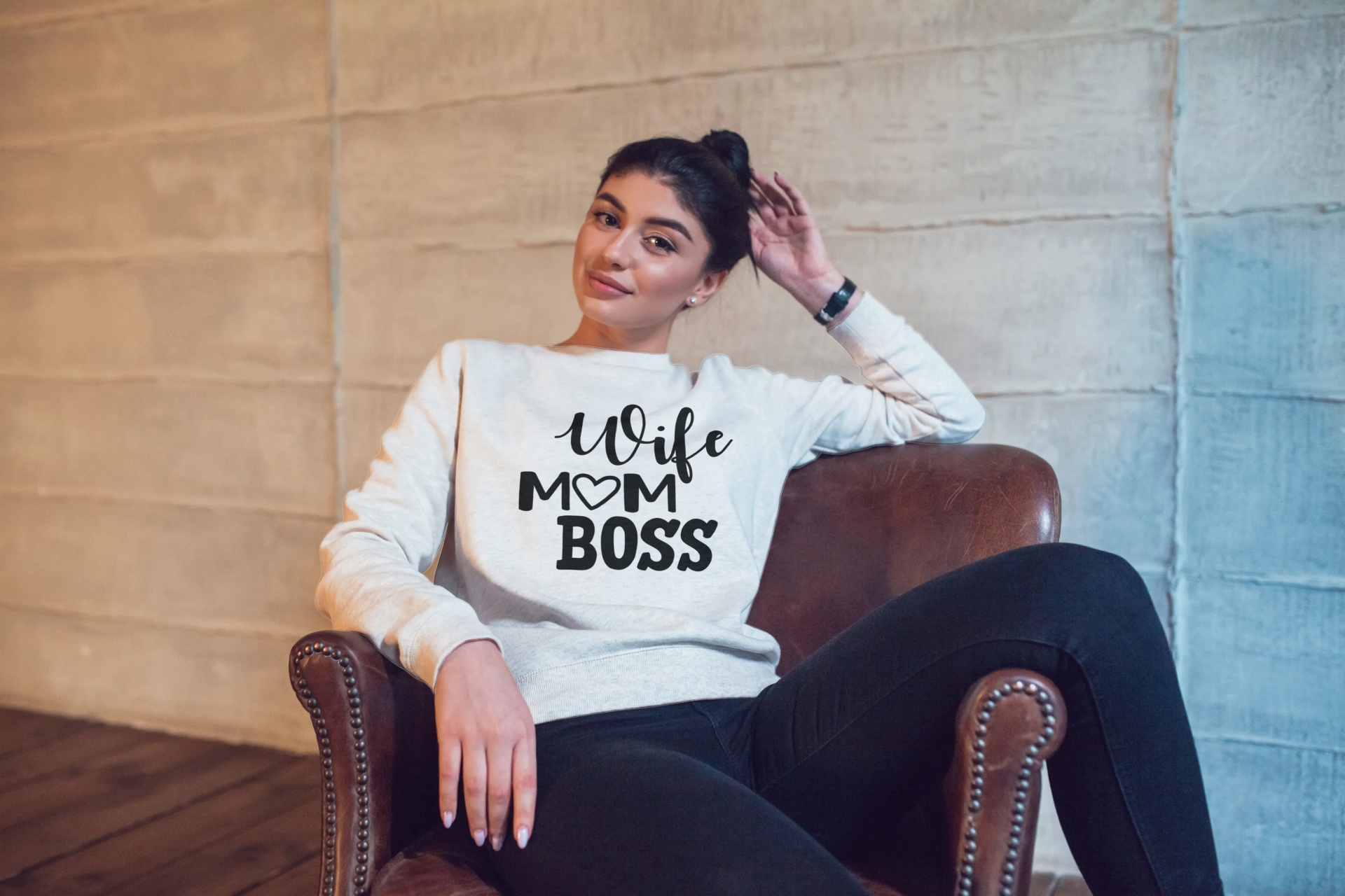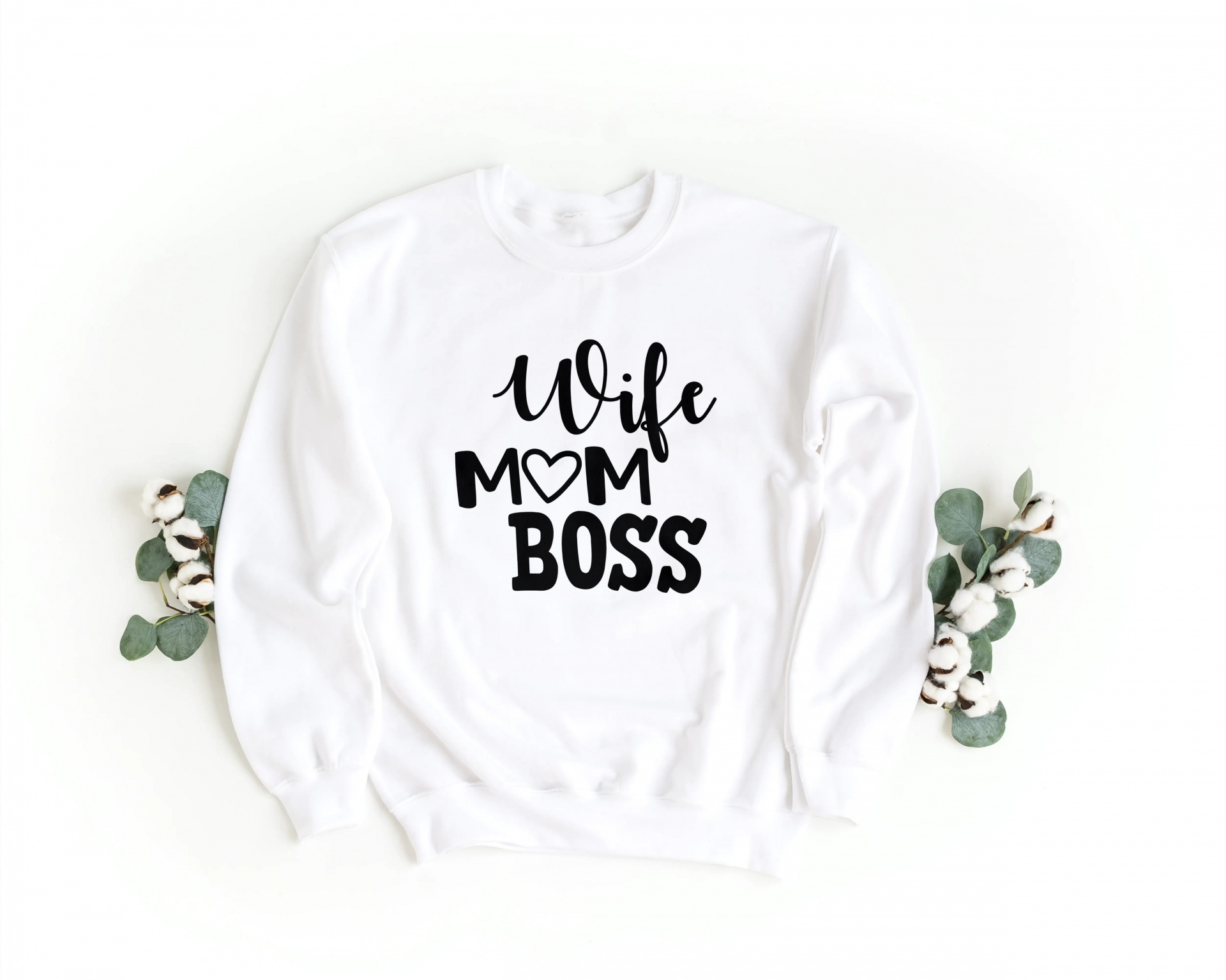 Sweatshirt branca com texto preto 'Wife MOM BOSS' rodeada por ramos de eucalipto e algodão