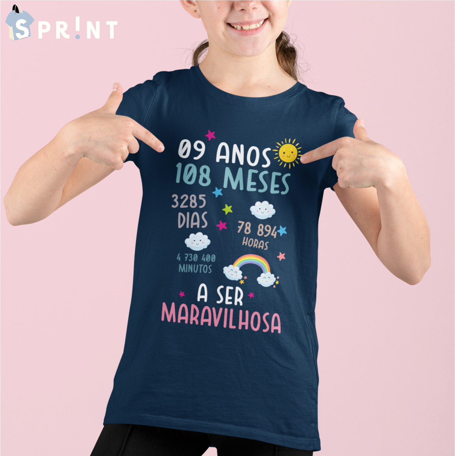 Camiseta azul escura com texto colorido e desenhos, vestida por criança sobre fundo rosa