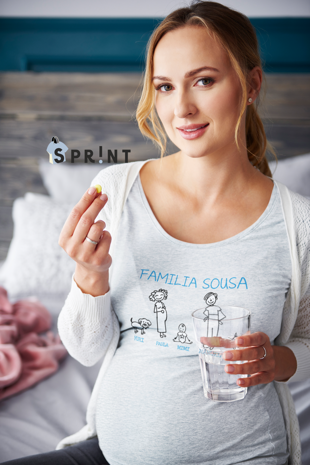 Mulher grávida com camisola familiar cinzenta clara segurando comprimido e copo de água