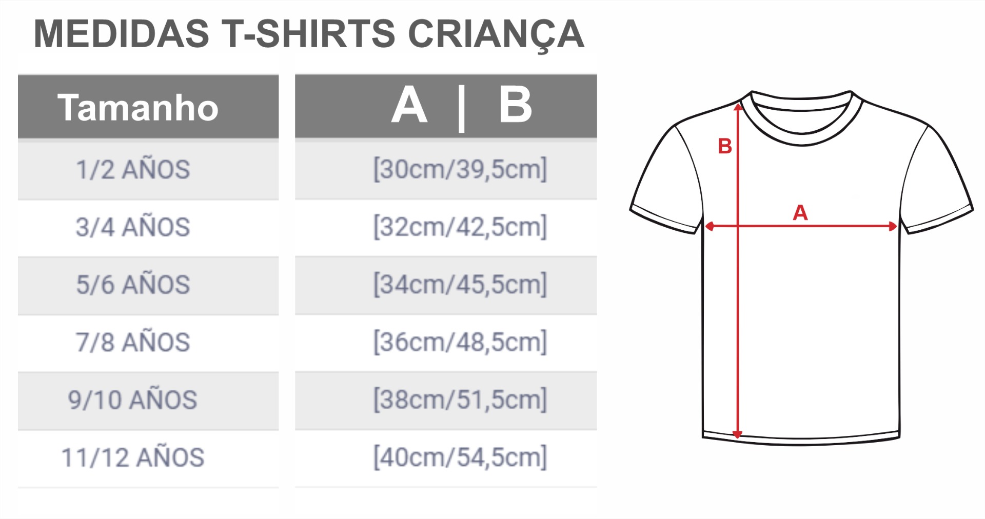 Tabela de medidas para t-shirts de criança com esquema de medição