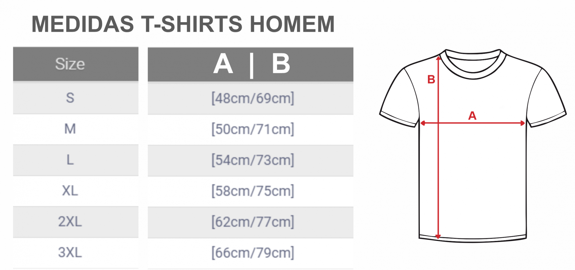 Tabela de medidas de T-shirts de homem com tamanhos e medidas indicadas