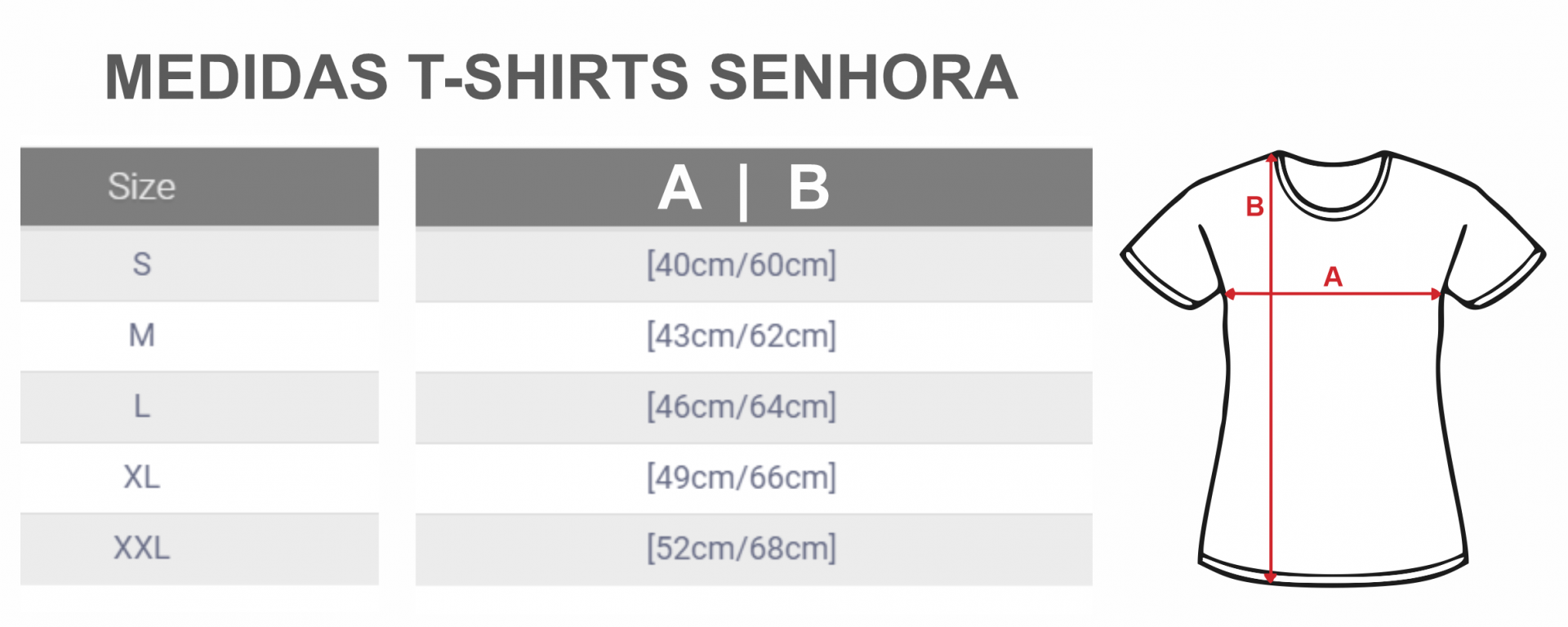 Tabela de medidas de T-shirts Senhora com dimensões A e B indicadas em desenho de T-shirt