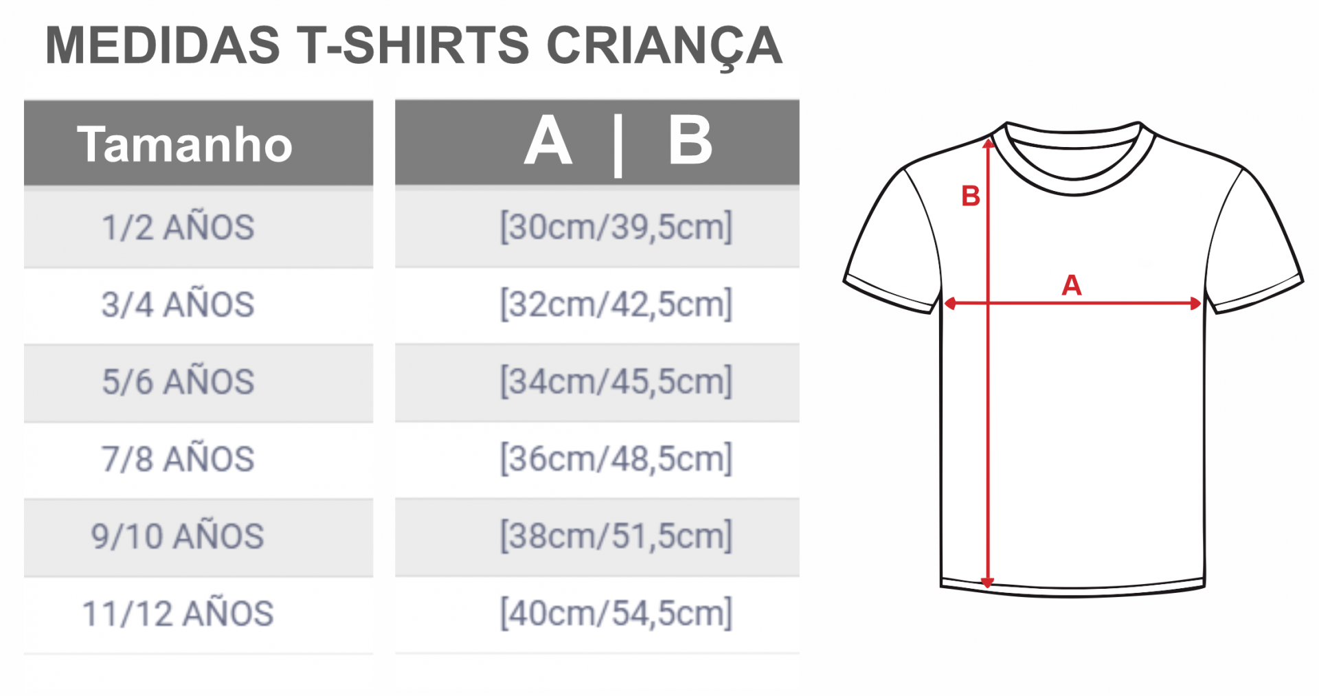 Tabela de medidas de T-shirts para criança com tamanhos e medidas em cm e ilustração da T-shirt