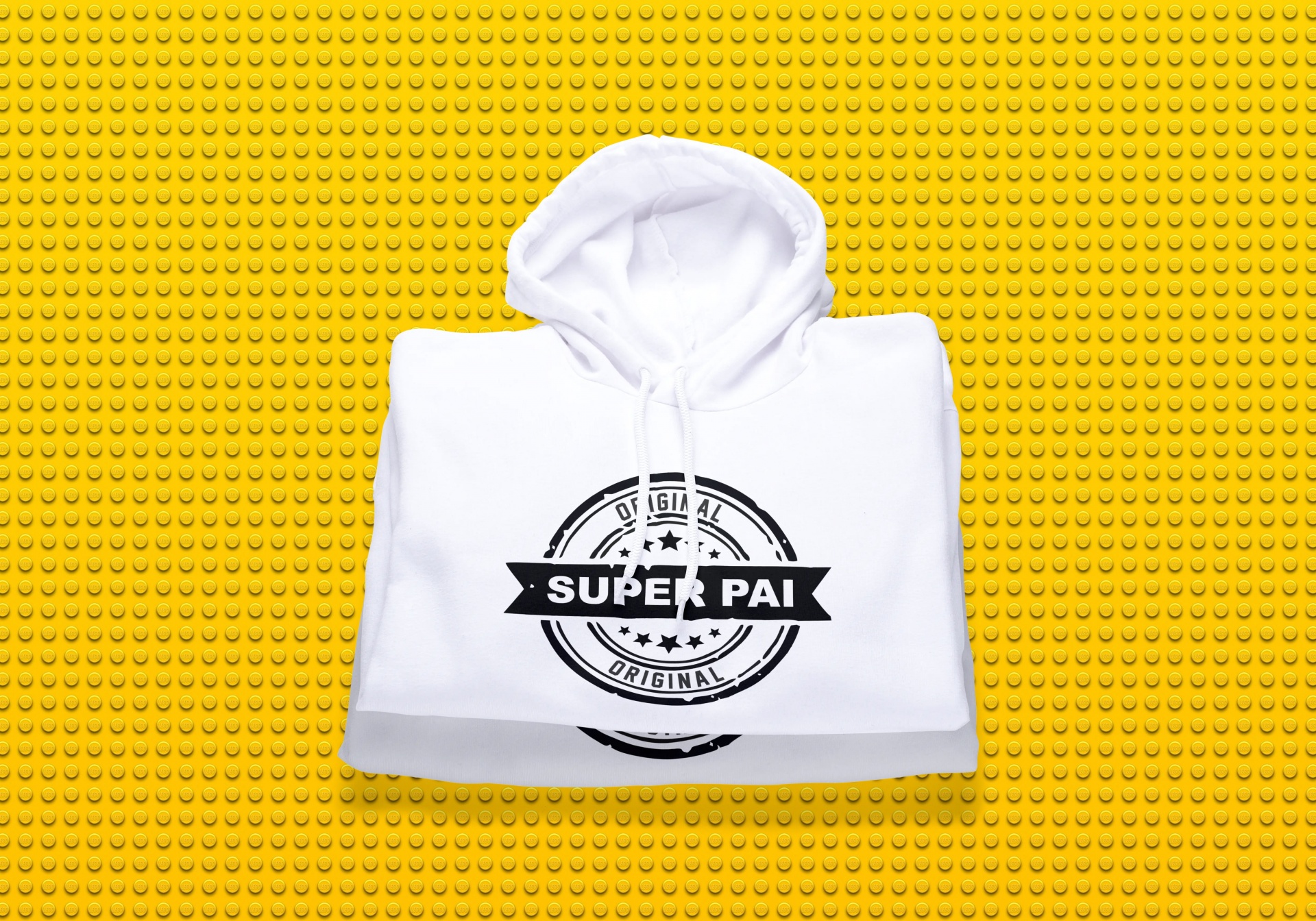 Sweatshirt branca com capuz e estampa 'SUPER PAI ORIGINAL' sobre fundo amarelo de peças lego.