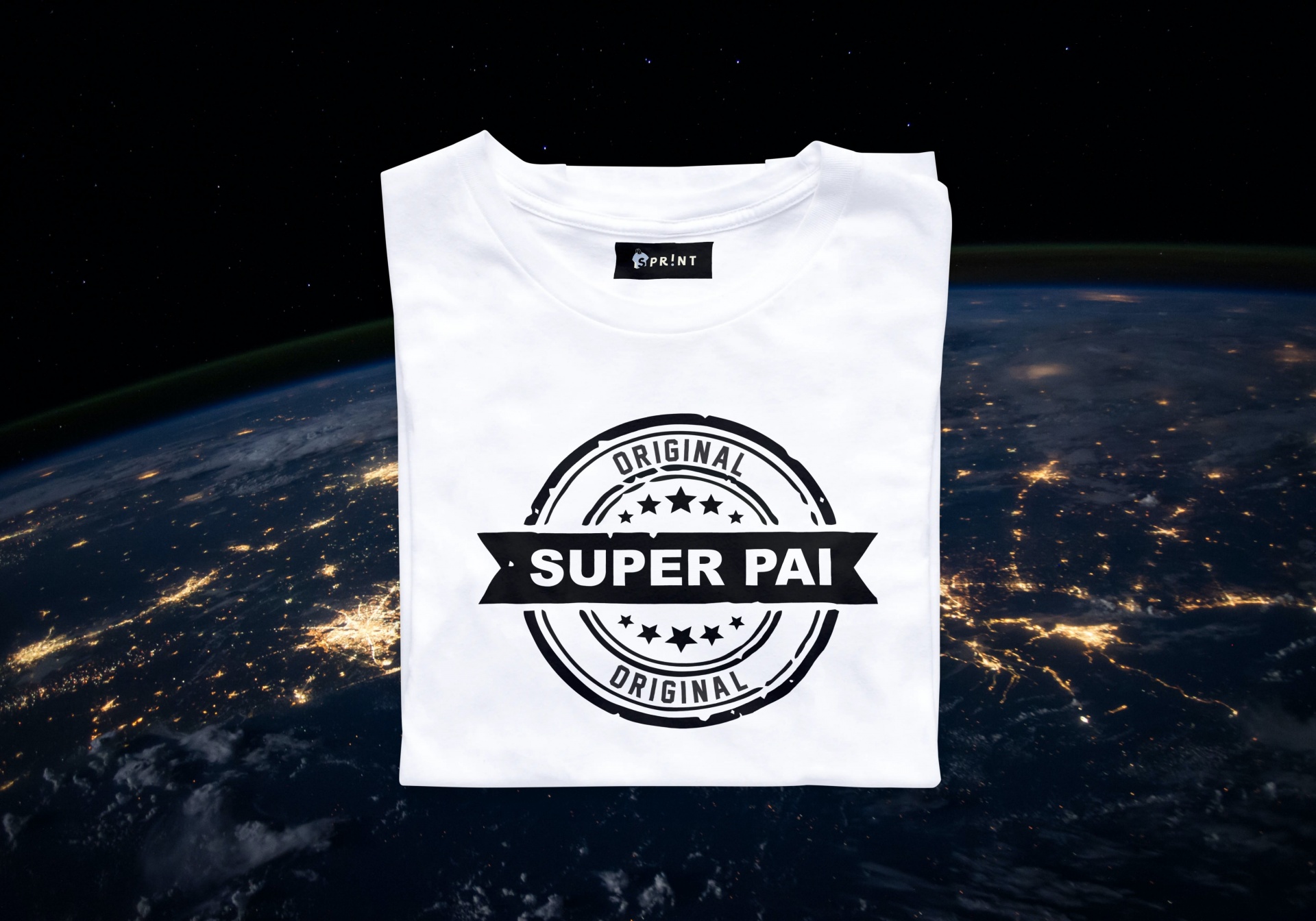 Camisola branca com estampa 'SUPER PAI' sobre imagem da Terra vista do espaço à noite
