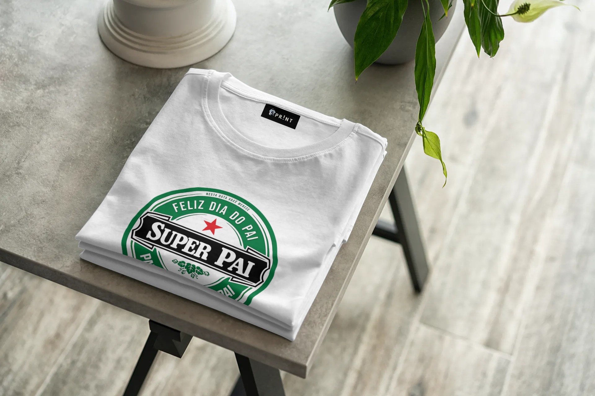 T-shirt branca dobrada com estampa 'FELIZ DIA DO PAI SUPER PAI' junto a uma planta em vaso