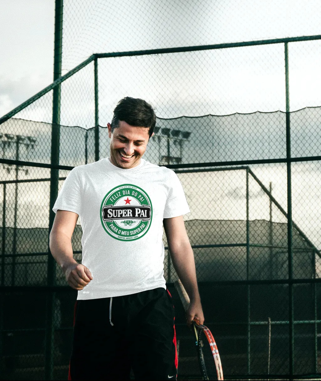 Homem com t-shirt branca com mensagem dia do pai, calça preta, segurando raquete de ténis numa quadra de ténis
