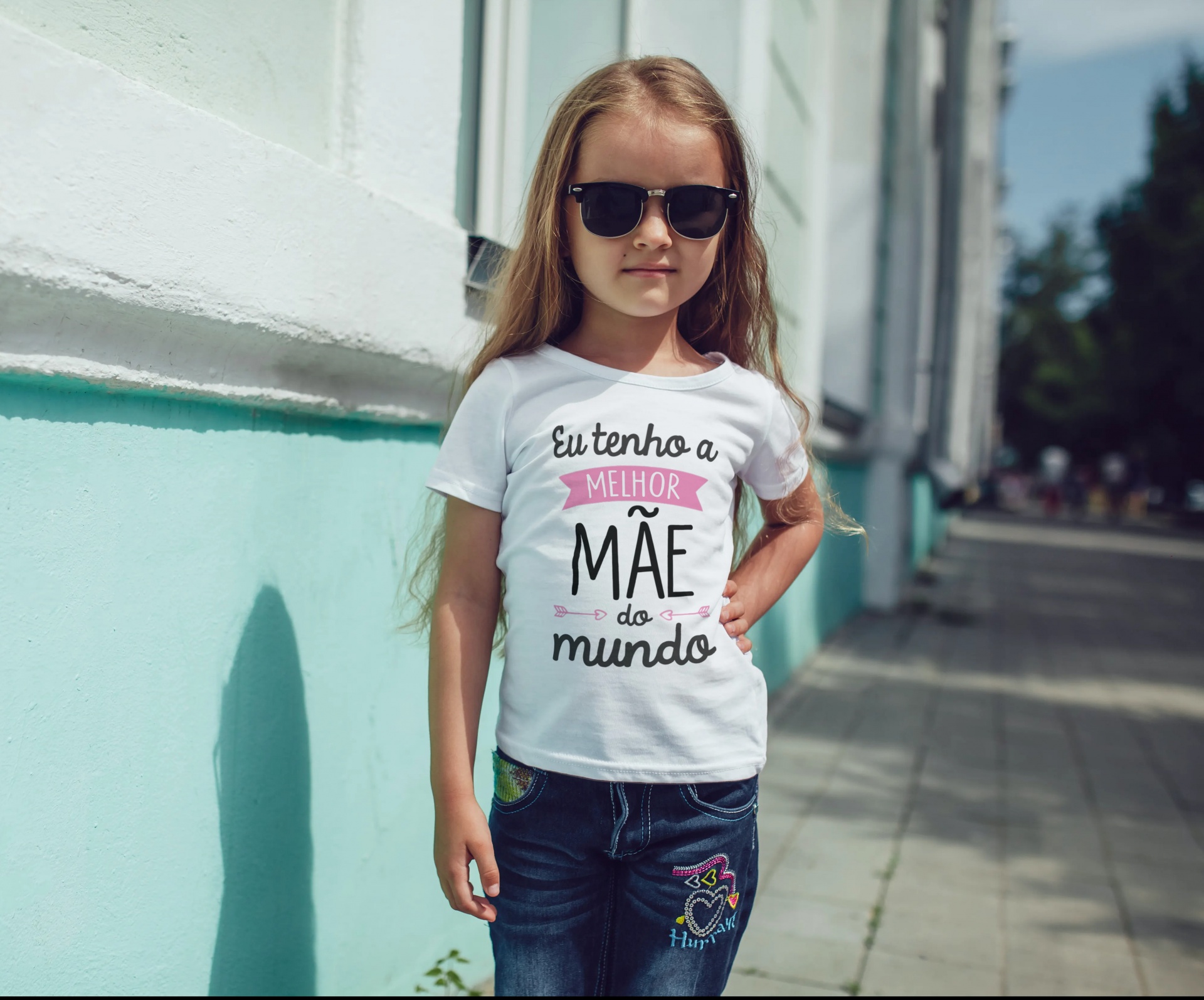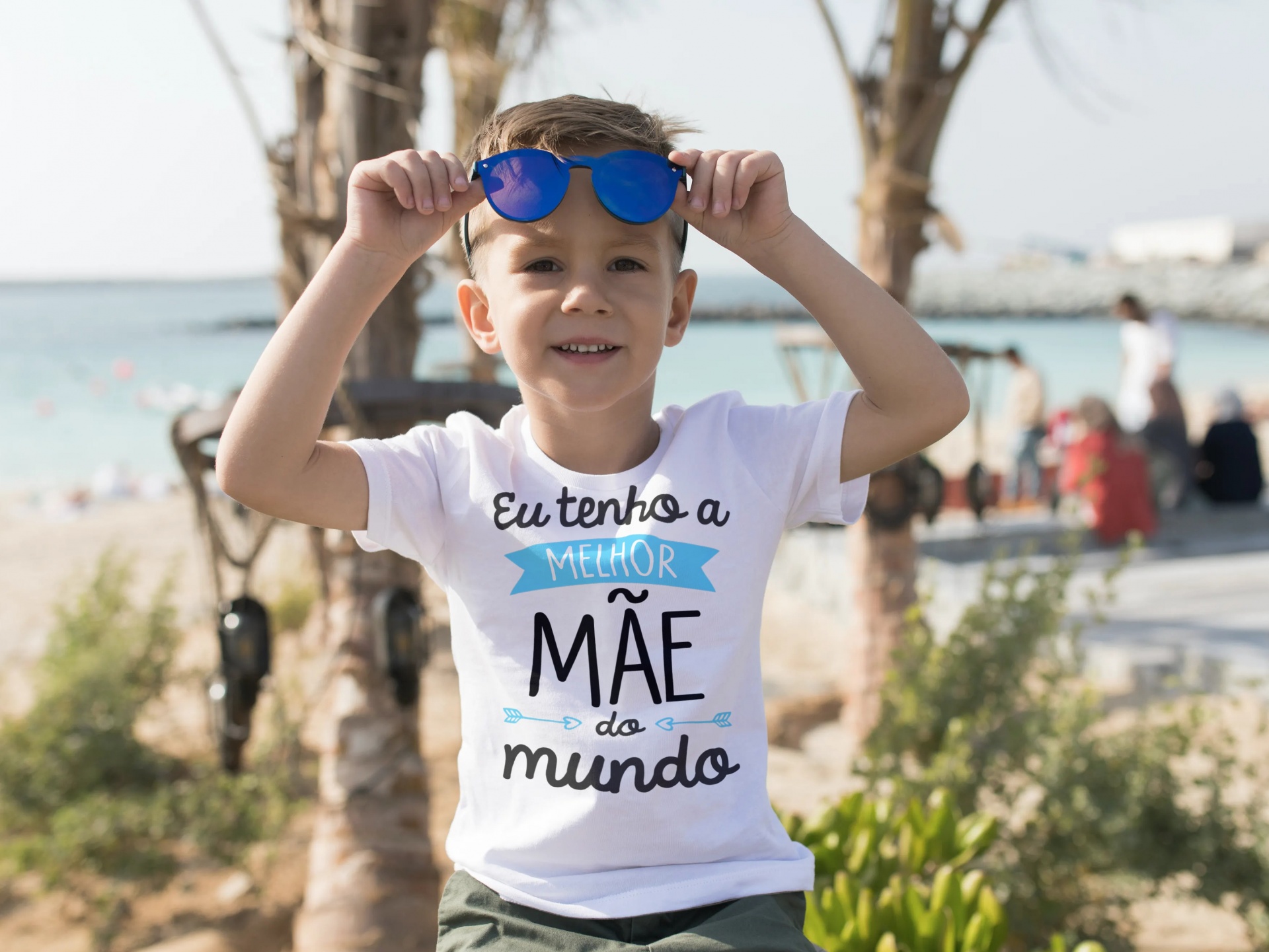 Criança a usar camiseta branca com texto em português e calças de ganga bordadas junto a uma parede azul e branca
