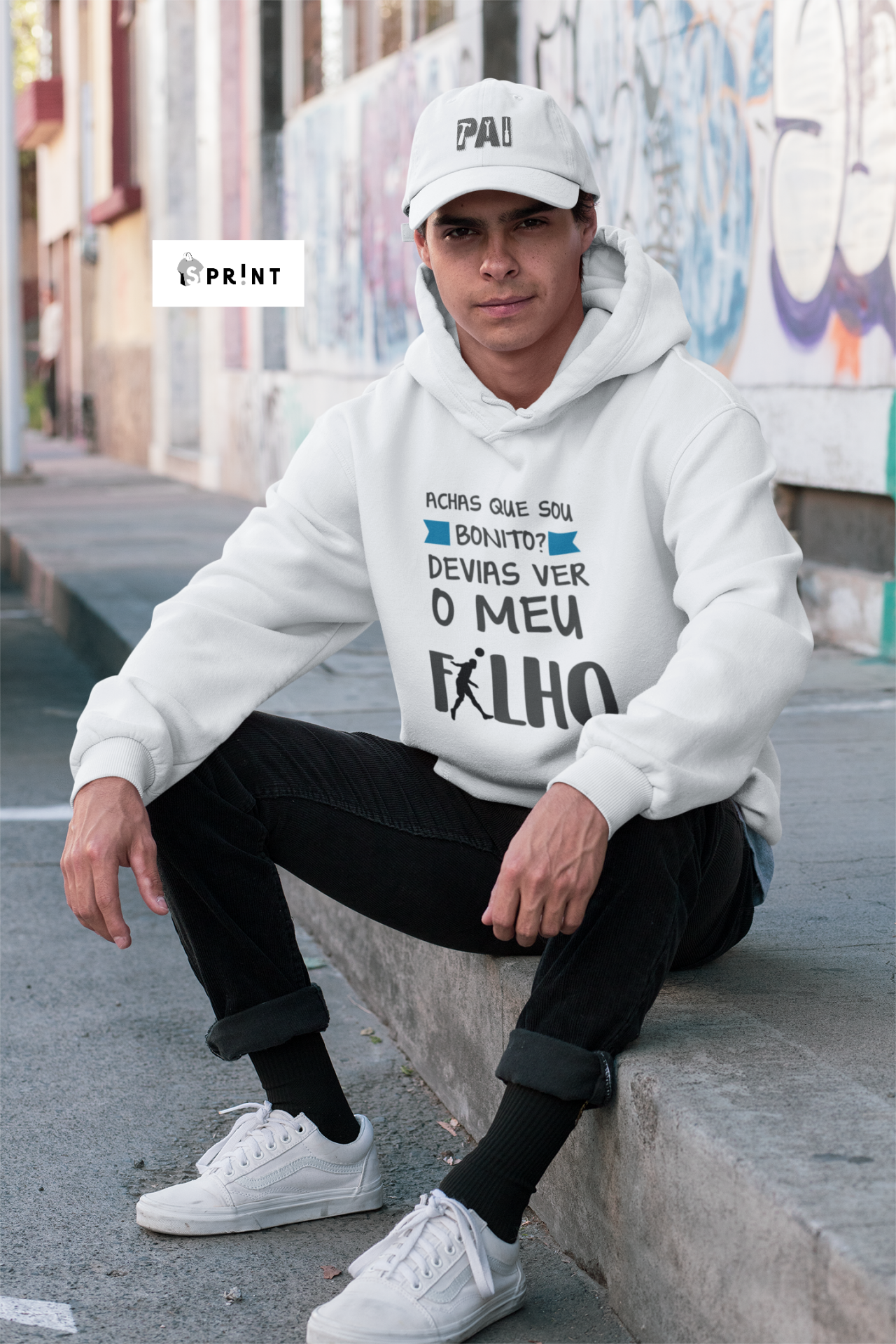 Homem e criança sentados num sofá cinza, usando t-shirts com texto em português, e o homem a tirar uma selfie com telemóvel