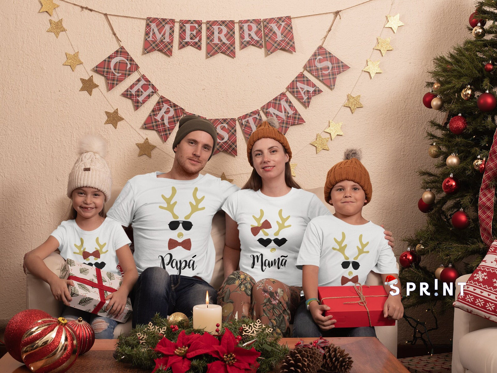 Família vestindo t-shirts natalícias com tenda ao fundo decorada com guirlanda e árvore de Natal