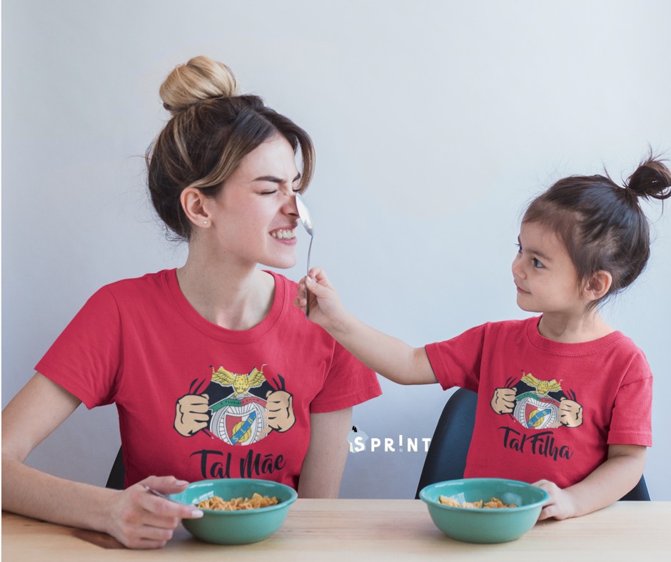 Duas t-shirts vermelhas, para mãe e filha, com desenho e texto, pessoas a partilhar refeição à mesa