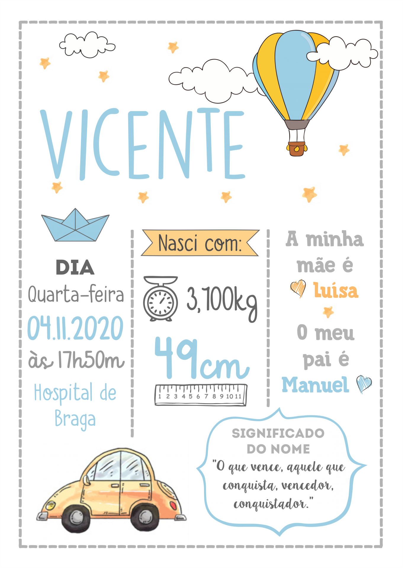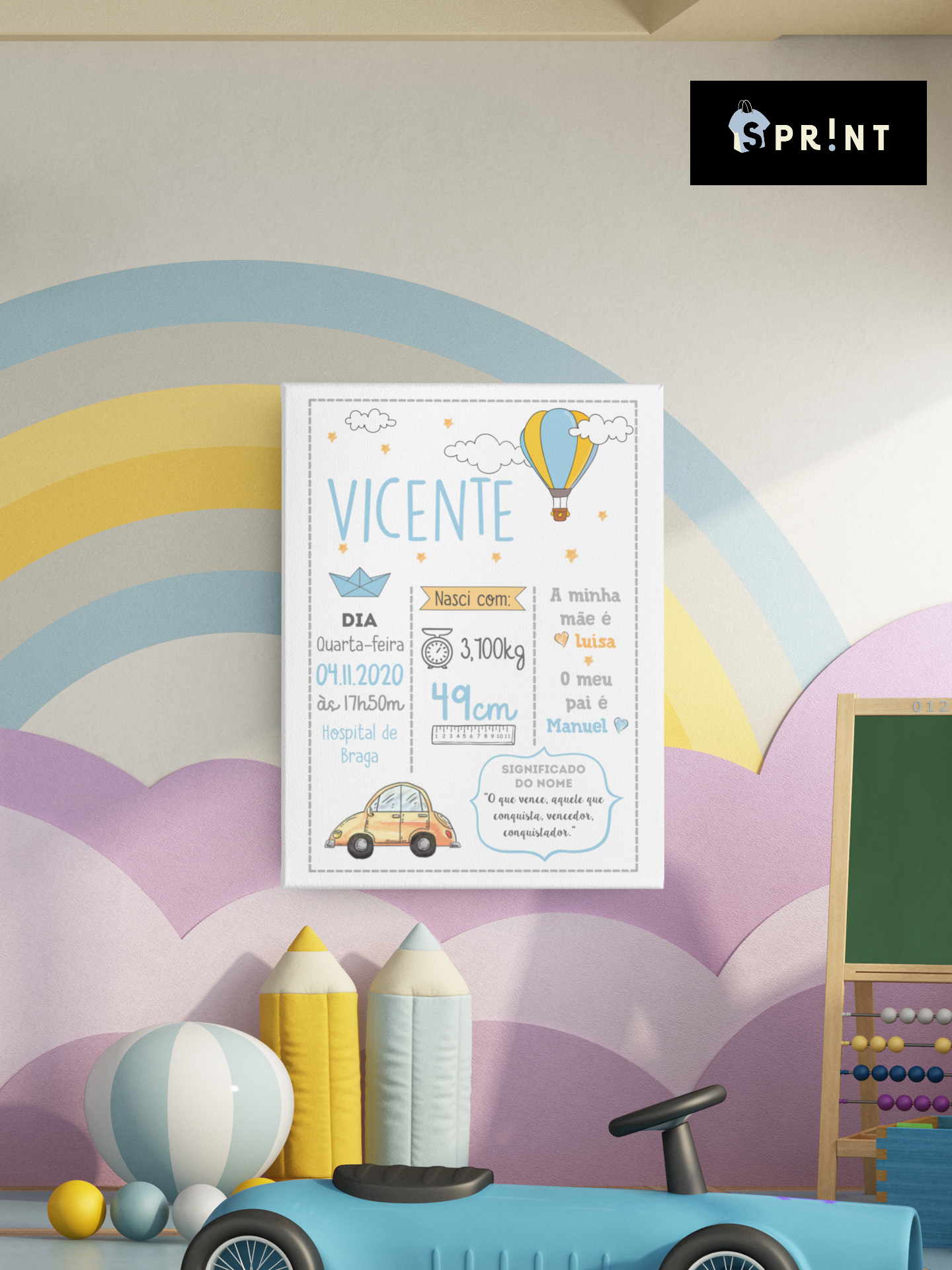 Cartaz de nascimento Vicente com dados e desenhos coloridos numa parede com arco-íris e brinquedos infantis.