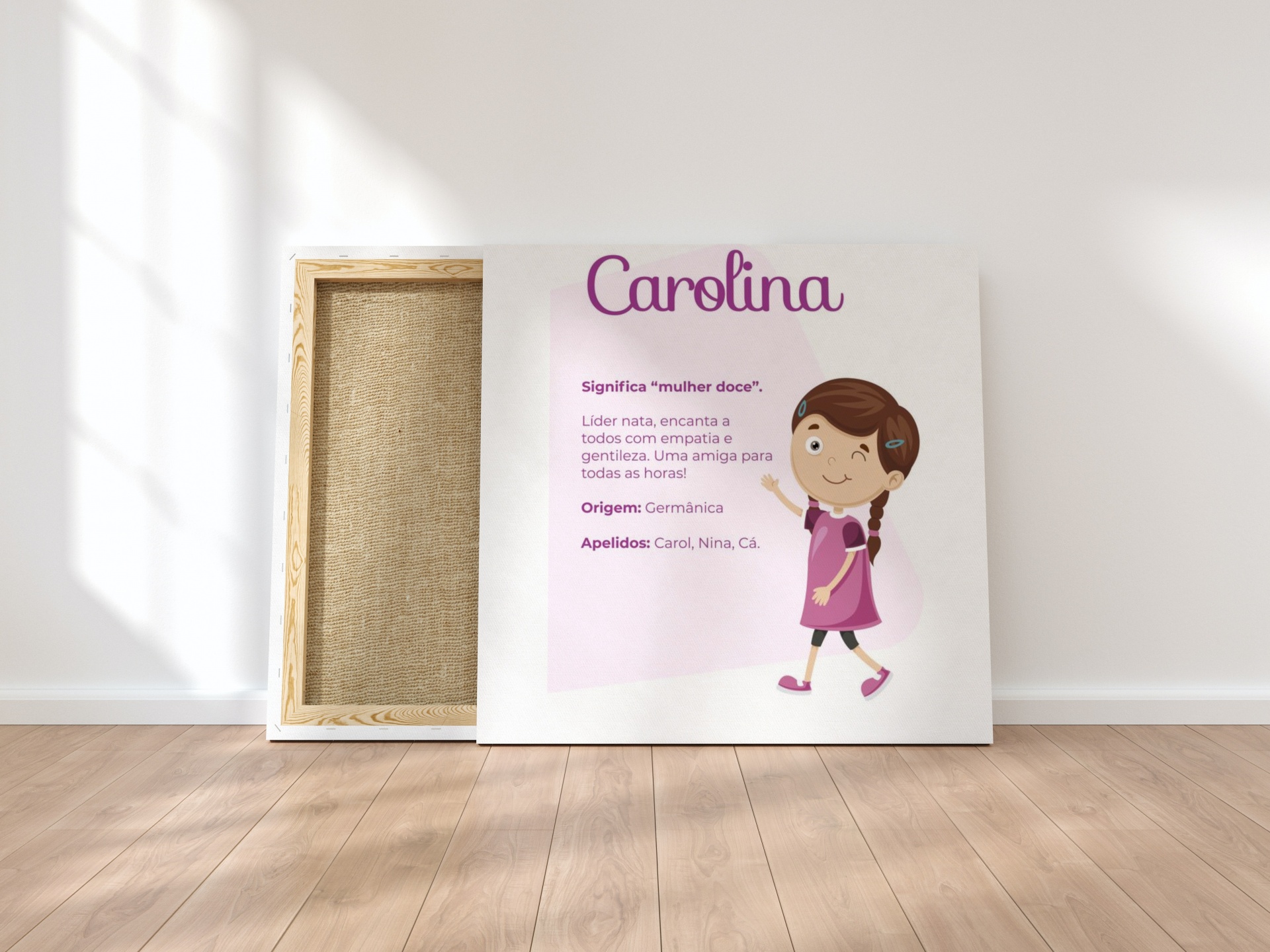Dois quadros, um com lona esticada em moldura de madeira, outro com texto e ilustração de menina vestida de roxo