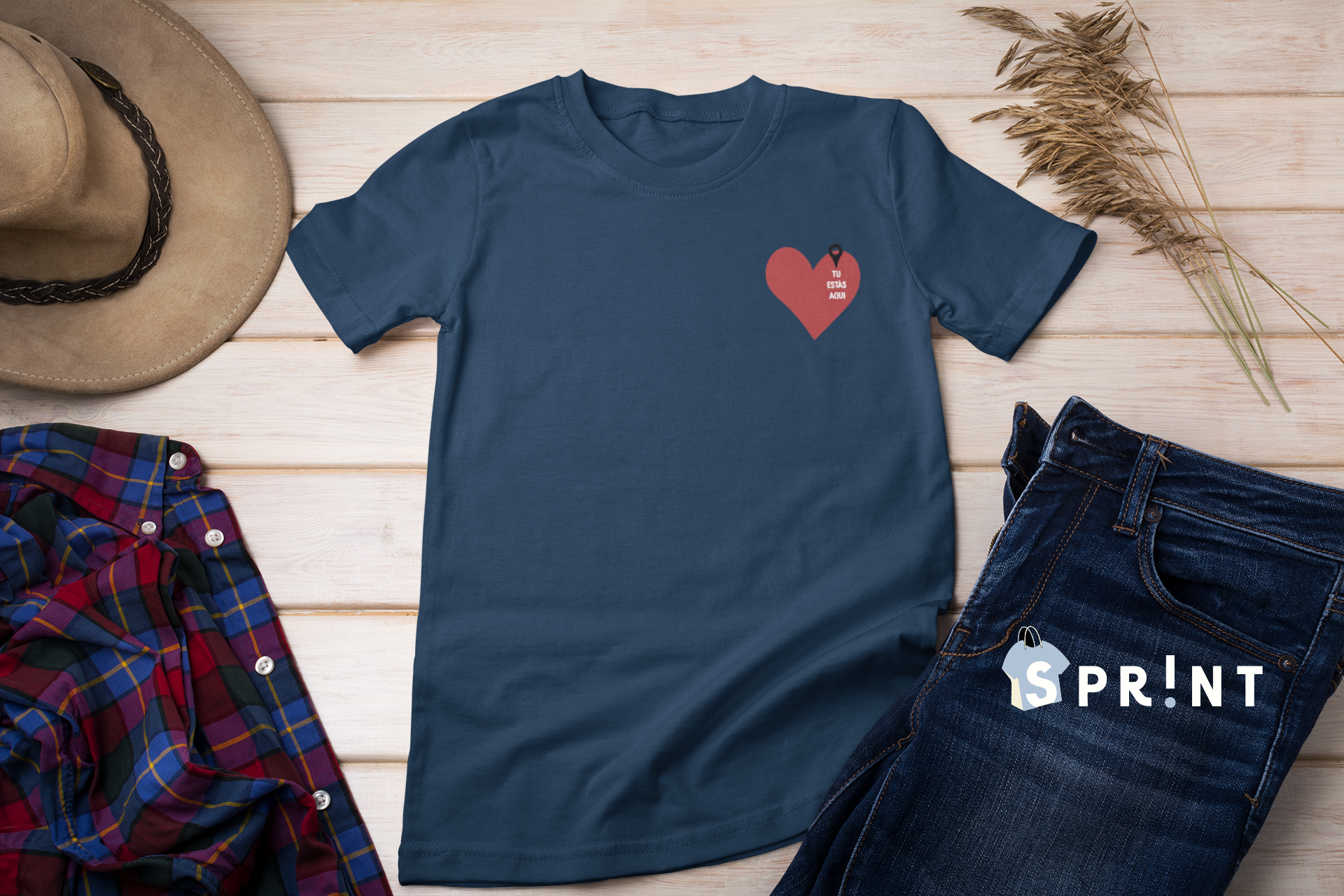 T-shirt azul escura com coração vermelho e texto, chapéu castanho, camisa xadrez e calças de ganga escuras