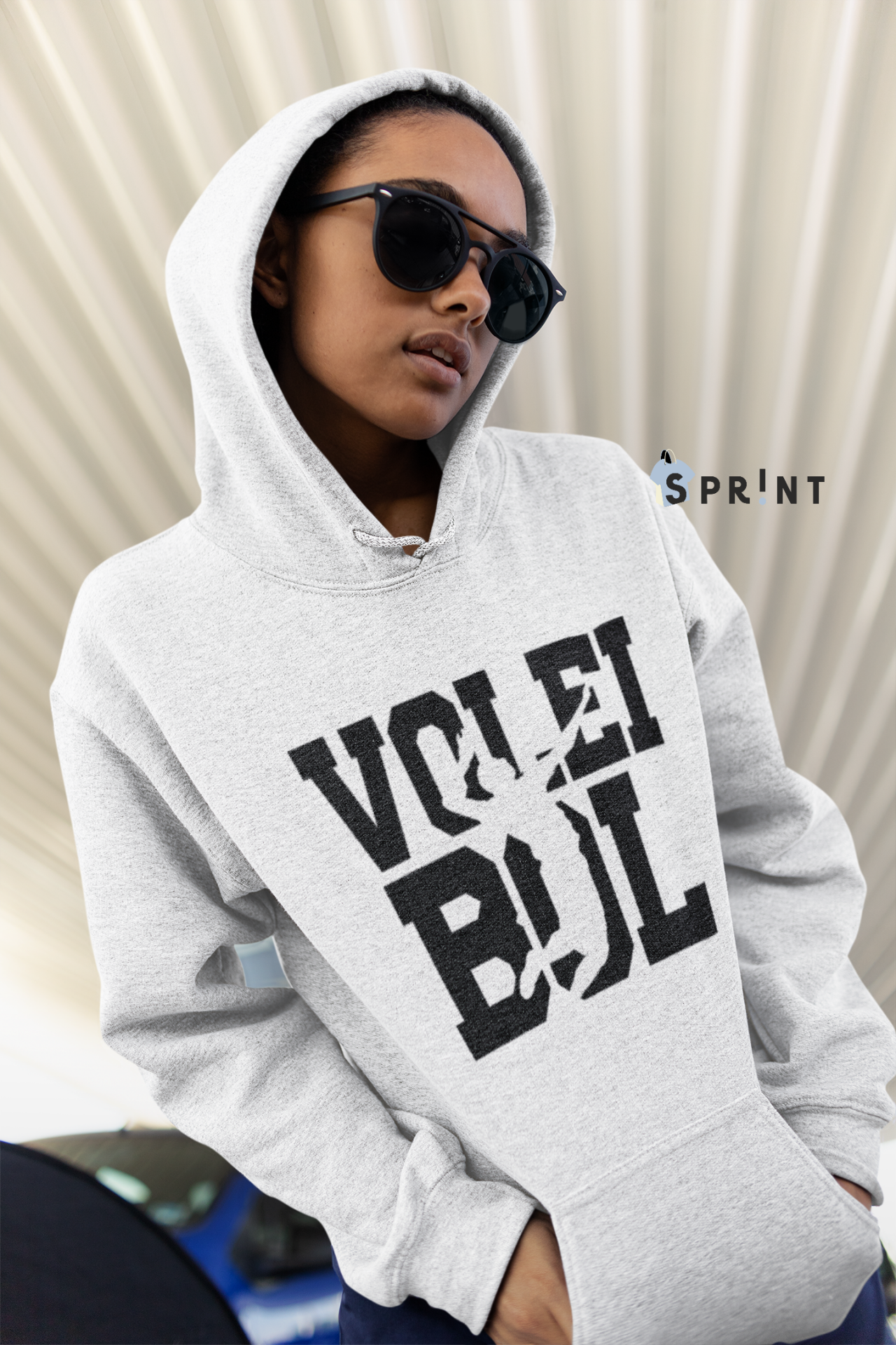 Modelo a usar sweatshirt cinzenta com capuz estampada com VOLEIBOL e silhueta de jogadora