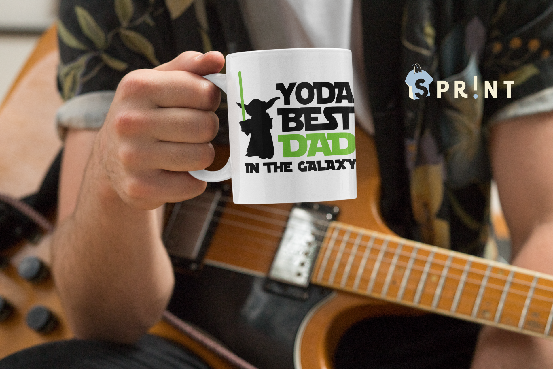 Caneca branca com texto YODA BEST DAD IN THE GALAXY numa mão, pessoa com guitarra ao fundo